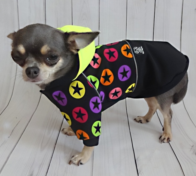 Bundička s rukávom je ušitá z kvalitného softshellu. Veľmi pohodlná. Na chrbátiku a rukáve reflexné paspule. Zapínanie na brušku. Je aj v prevedení so stojáčikom miesto kapucky. Kapucka je vo farbe: neón žltá, oranžová, čierna. Kapucka, stojáčik, karička na vodítko, podľa želania zákazníka.